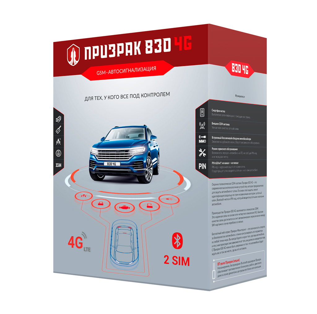 Новейшая GSM-автосигнализация Призрак-830 4G имеет отличное оснащение, богатый набор сервисных возможностей и функции интеллектуальной охраны. Для защиты автомобиля имеются противоугонные функции Immobilizer и AntiHiJack. В комплект сигнализации включены две Slim-радиометки, выносной датчик температуры, по показаниям которого можно выполнять автозапуск двигателя и звуковая сирена.